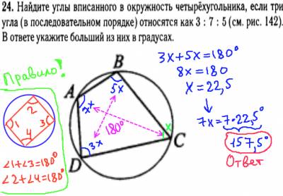 При решении этой геометрической задачи ГИА, главное вспомнить что сумма противоположных углов вписанного четырехугольника всегда равна 180 градусов. Таким образом, 3x+5x=180, следовательно одна часть x=22,5; отсюда наибольший угол равный 7x=7*22,5=157,5 градуса.