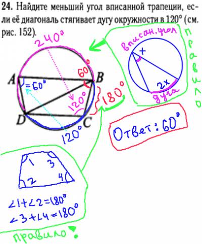 В ходе решения данной геометрической задачи, мы вначале находим угол трапеции A, который опирается на дугу в 120 градусов - он будет в 2 раза меньше, т.е. 120/2=60°. Также можно найти и противолежащий вписанный угол C, который тоже будет равен 120 градусов (его дуга равна 360-120=240, т.е. 240/2=120). Затем, на всякий случай находим односторонний угол B, который равен 180-120=60° (сумма односторонних углов четырехугольника равна 180). В любом случае, меньший угол трапеции будет 60 градусов.