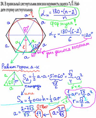 Решая данную задачу ГИА, мы должны вспомнить формулу нахождения углов правильных многоугольников, подставляем в нее число 6 и находим, что каждый угол правильного шестиугольника равен 120. Этот угол делится пополам по 60°, отрезками, проведенными из центра окружности к углам. Таким образом, мы получим равносторонний треугольник, т.к. каждый его угол по 60°. Запишем 2 формулы площади данного треугольника: через две стороны и синус угла между ними; через основание и высоту треугольника. Приравняем эти площади и выразим из них сторону правильного шестиугольника через радиус вписанной окружности. Останется подставить вместо радиуса число 7?3 и получим ответ 14.