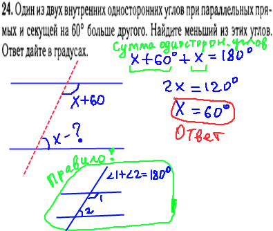 При решении задания ГИА, вспоминаем что сумма односторонних углов равна 180°, т.е. x+(x+60)=180°; отсюда x=60 градусов - это и есть меньший из углов.