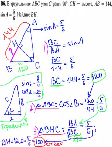 Вспомним формулировку синуса острого угла - отношение противолежащего катета к гипотренузе, отсюда по формуле мы найдем сторону BC=120. Затем по формуле косинуса острого угла (отношение прилежащего катета на гипотенузу) - найдем в треугольнике ABC косинус угла B=5/6. Потом, точно также рассмотрим ?BCH и ?B, откуда выразим сторону BH=100.