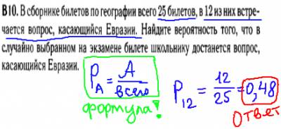 Вспоминаем формулу вероятности события - это отношение количества случаев определенного события на все случаи, т.е. 12 билетов по Евразии делим на все 25 билетов: 12/25=0,48.