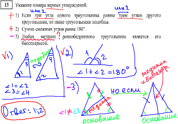 В 13 задании ГИА 2013 года: 1-ое утверждение верно, т.к. треугольники будут подобны даже если 2 угла одного будут равны 2-ум другого. Второе - тоже верно, т.к. по теореме сумма смежных углов всегда равна 180 градусов. Третье утверждение неверно, т.к. не любая медиана, а медиана, проведенная к основанию равнобедренного треугольника будет являться биссектрисой.