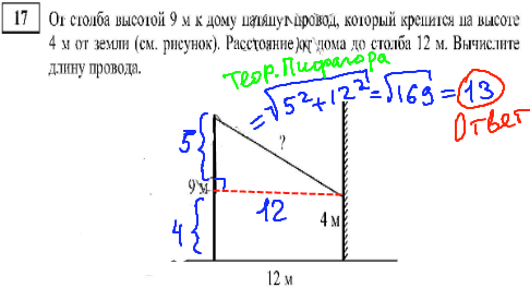 В этом задании ГИА по математике из реального варианта 2013 года - мы проведем параллельную прямую, получим прямоугольный треугольник. По теореме Пифагора найдем его гипотенузу, в ответе получим 13.