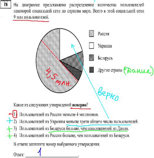 В задании №18 дана круговая диаграмма - смотрим на нее внимательно и выбираем неверные утверждения. В данном случае лишь первый вариант ответа будет неверным, т.к. если мы разделим диаграмму пополам, то увидим что пользователей из России никак не меньше 4 миллионов человек.