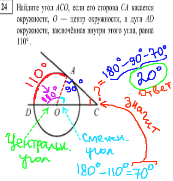 В 24 задании ГИА 2013 из 2 части по модулю Геометрия, мы должны найти угол. Для этого проведем в окружности радиус OA, который всегда будет перпендикулярен касательной AC (по теореме). Т.е. получим прямоугольный треугольник AOC , где угол A=90 градусов. Затем рассмотрим центральный угол DOA, который будет равен дуге в 110 градусов (по теореме). Отсюда смежный угол AOC=180?-110?=70?. Рассматривая треугольник AOC, найдем ?C=180?-90?-70?=20?.