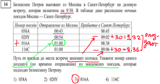 В следующем задании ГИА по модулю "Реальная математика", сразу убираем 2-ой и 4-ый номера поездов, т.к. прибавив полчаса к времени прибытия, пассажир уже опоздает на встречу. Выбираем между 1-ым и 3-им номерами, видно что в 3-ем - время выезда позже (в 1.00), чем во втором (в 00.43). Ответ: 3)