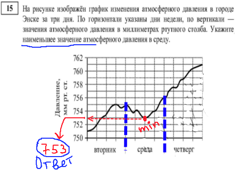 15 задание из реальной математики очень простое - смотрим на график зависимости - день среда, находим самое наименьшее значение давления, оно равно 753.