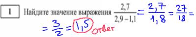 В первом задании варианта ГИА мы считаем знаменатель, а потом для удобства сдвигаем запятую на одну позицию вправо, сокращаем 27 и 18 на 9 - получаем 3/2=1,5.