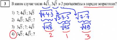 В третьем задании модуля Алгебра, заносим под квадратный корень все числа, а затем сравнивая числа под корнем, располагаем их в порядке возрастания, т.е. от меньшего к большему.