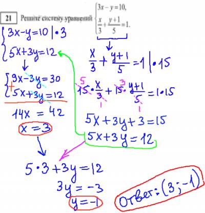 Решим 21 задание из второй части ГИА 2013 года - здесь представлена система уравнений. Вначале преобразуем 2-ое уравнение, избавимся от знаменателей, домножив обе части на 15. После сокращений, останется 5x+3y=12. Затем решим систему методом сложения/вычитания, домножив первое уравнени на 3. Сложим 1-ое и 2-ое уравнения, получится: 14x=42, т.е. x=3. Подставив число 3 в любое из уравнений, найдем что y=-1.
