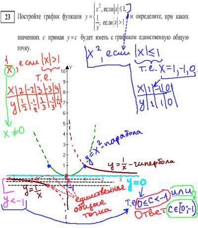 |x|?1 (т.е. x должен быть по модулю меньше или равен единице, например, 1;-1;0,9;-0,9; 0,8; -0,8; и т.д.) и гиперболу y=1/x при x>1. Составляем таблицы и по найденным точкам чертим график. Затем смотрим на рисунок и чертим прямые, которые при пресечении с графиком дают одну общую точку (отметил их красным цветом). Получается много прямых горизонтальных линий, т.е. y=0; y=-0,1; y=-0,2 и т.д. до y=-0,999... вообщем ответ: 0