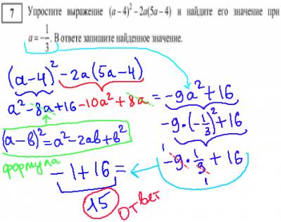 В 7-ом задании реального варианта ГИА 2013 года - мы упрощаем буквенное выражение, используя формулу квадрата разности, а затем подставляем вместо буквы a число -1/3. Получим в ответе -15.