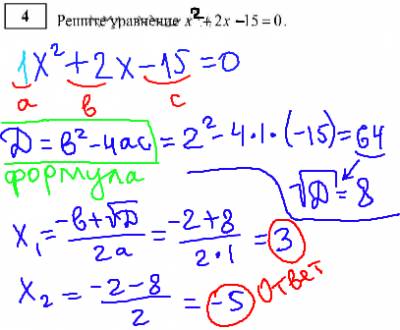 Четветрое задание - обычное квадратное уравнение, которое решаем по дискриминанту, находим 2 корня 3 и -5.