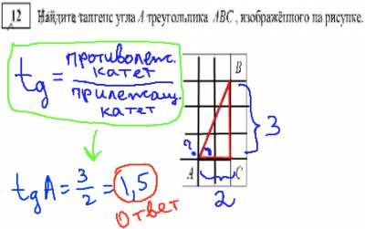 В 12 задаче ГИА из реального варианта, нужно найти тангенс острого угла, т.е. противолежащий катет делим на прилежащий, получим 3/2 или 1,5.