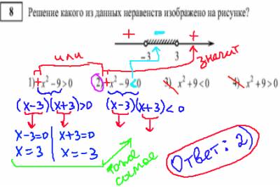 В восьмом задании ГИА решаем сокращенное квадратное неравенство. Сразу убираем 3 и 4 варианты ответов, т.к. там знак +. А нам нужна разность квадратов, т.е. 1 или 2 варианты ответов. Второй ответ нам подойдет, т.к. неравенство со знаком < заштриховывает промежуток со знаком минус.