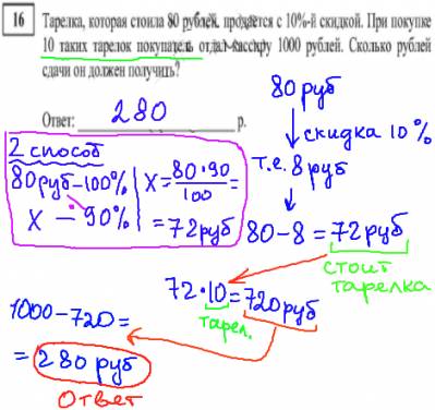 В задании ГИА номер 16 - мы решим задачу на проценты. Вначале посчитаем скидку 10% - это 8 рублей. Следовательно, стоимость тарелки будет 80-8=72 рубля, 10 тарелок = 720 рублей. Тогда сдача составит 1000-720=280 рублей.