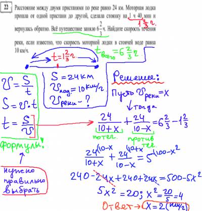 22 задание из второй части ГИА 2013 - это текстовая задача на скорость, время и путь. Здесь мы воспользуемся формулой времени t, выразив ее через путь 24 км, деленный на скорость лодки по течению и против течения реки. Получим уравнение, решив которое найдем скорость течения x=2 км/ч.