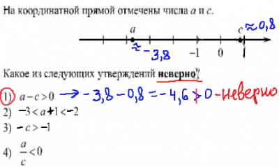 Во 2-ом задании ГИА отмечаем примерные числа на координатной прямой, затем подставляем вместо букв a и с. Первый вариант ответа нам подойдет, т.к. -4,6 не может быть больше нуля.