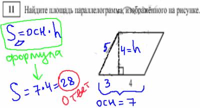 В 11 задаче по геометрии находим площадь параллелограмма по формуле: основание умножаем на высоту h, получим 28.