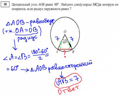В десятом задании ГИА 2013 мы сразу видим, что треугольник равнобедренный, т.к. 2 стороны равны (радиусы окружности), следовательно, углы A и B равны между собой, т.е. (180-60)/2=60. Отсюда, т.к. все углы по 60 градусов, то треугольник будет равносторонним, следовательно, хорда = 7.