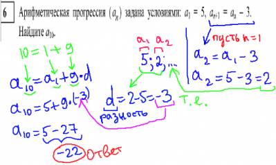 В следующем задании мы находим второй член арифметической прогрессии (т.к. 1-ый уже известен), чтобы найти разность d, равная -3. Затем по формуле находим десятый член прогрессии = 22.