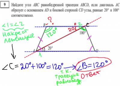 В 9 задании ГИА реального варианта по модулю Геометрия мы смотрим на накрест лежащие углы, равные по 20 градусов. Отсюда угол C будет 120, следовательно т.к. трапеция равнобедренная, то и искомый угол B=120 градусов.