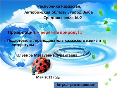 В данной мультимедиа презентации для детей рассказывается про экологические даты и праздники, лесные пожары, а также про известные природные заповедники России и Казахстана. В последнем слайде презентации учащимся даются добрые советы по охране и бережному отношению к природе .