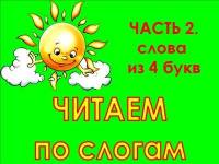 Благодаря данной детской powerpoint презентации, ребята начальных классов смогут лучше понять и научиться читать слова по слогам, состоящим из четырёх букв. К каждому слову-слайду даётся своя картинка для лучшего запоминания и усвоения детьми чтения по слогам.