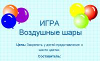Цель данной презентации закрепить понятие и представление у детей о шести разных цветах на основе шариков. В детской презентации ребята должны будут сопоставить одинаковые цвета.