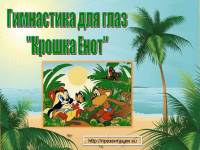В детской powerpoint презентации ребятам 3-4 лет будет предложена гимнастика для глаз с героями детского мультика "Крошка Енот". Физминутка будет сопровождаться песней и музыкой из данного мультфильма.