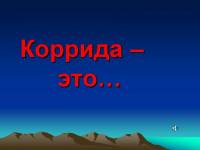 В детской презентации говорится об истоках и истории появления испанского зрелища корриды. Рассказывается об особенностях боя с быками, о его правилах, об участниках - тореро, тореадоре, пикадоре, матадоре. Данная powerpoint презентация знакомит ребят с одним из национальных испанских зрелищ, посвященных празднику фиесты.