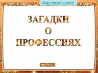 Слайды презентации сопровожаются загадками в виде стихов и рисунками в виде ответов. Детки дошкольного возраста и младших классов легко смогут угазать, например, где доктор, а где водитель. Преподаватель на примере данной презентации сможет узнать о том - насколько развит ребенок, насколько он сообразителен, что поможет в дальнейшем помочь ребенку в развитии внимательности, увлекая его в мир загадок и ответов.