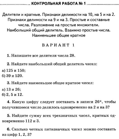 Контрольная работа по математике 6 класс: Делители и кратные. Признаки делимости.