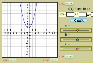 Онлайн калькулятор по математике быстро строит графики квадратичной функции y=ax2 +bx+с при помощи передвижения ползунков. Можно также просто ввести нужные коэффициенты , и нажать на кнопку "Graph" - график тут же построится.