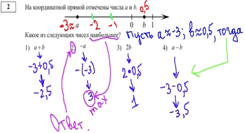 Во 2-ом задании из демоварианта ГИА по математике 2013 нужно определить наибольшее число на координатном луче, используя буквенные выражения. Принимаем за числа буквы a и b, подставляем в выражения и вычисляем.