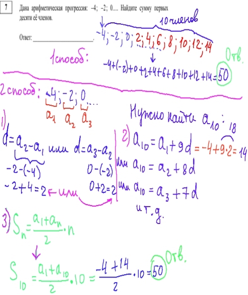 В 7 задании демоварианта ГИА по математике 2013 мы находим сумму первых 10 членов арифметической прогресии, используя 2 способа.