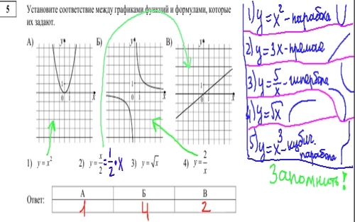 Пятое задание по математике для 9 класса - на соответствие графиков функций и формулами, здесь нужно знать основные формулы графиков функций, и некоторые их свойства.