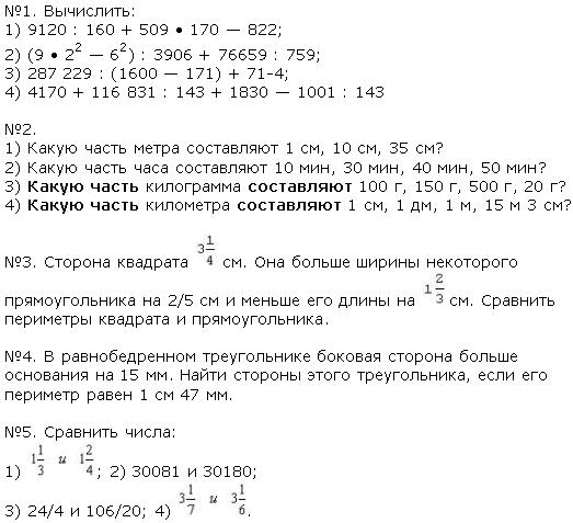 №1. Вычислить: 1) 9120 : 160 + 509 • 170 — 822; 2) (9 • 22 — 62) : 3906 + 76659 : 759; 3) 287 229 : (1600 — 171) + 71-4; 4) 4170 + 116 831 : 143 + 1830 — 1001 : 143 №2. 1) Какую часть метра составляют 1 см, 10 см, 35 см? 2) Какую часть часа составляют 10 мин, 30 мин, 40 мин, 50 мин? 3) Какую часть килограмма составляют 100 г, 150 г, 500 г, 20 г? 4) Какую часть километра составляют 1 см, 1 дм, 1 м, 15 м 3 см? №3. Сторона квадрата см. Она больше ширины некоторого прямоугольника на 2/5 см и меньше его длины на см. Сравнить периметры квадрата и прямоугольника. №4. В равнобедренном треугольнике боковая сторона больше основания на 15 мм. Найти стороны этого треугольника, если его периметр равен 1 см 47 мм. №5. Сравнить числа: 1) ; 2) 30081 и 30180; 3) 24/4 и 106/20; 4) .