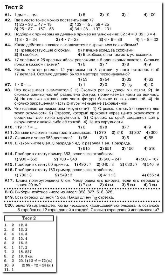 3 класса". Тест номер 2 создан в форме ЕГЭ, содержит 20 заданий и состоит из 3 частей А, В, С. В конце заданий есть ответы для проверки годовых знаний учащихся за 3 класс.
