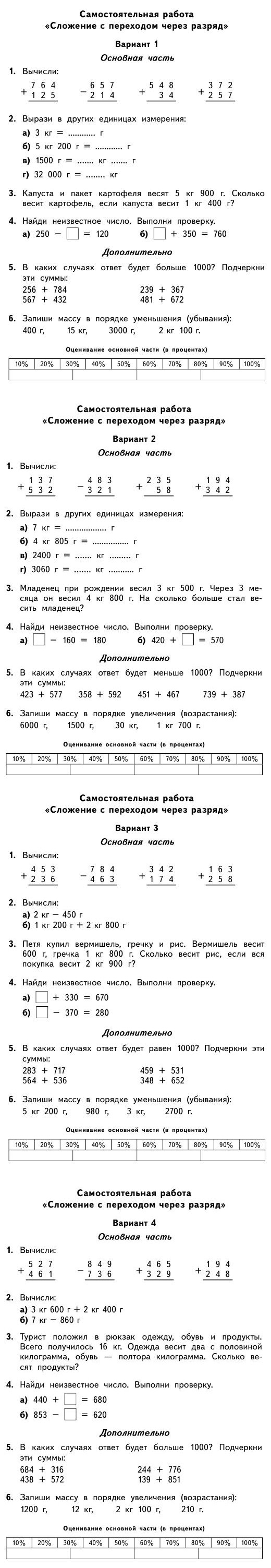 Смотрите онлайн самостоятельную работу по математике для учеников 3 класса на тему - "Сложение с переходом через разряд". В работе представлено 4 разных варианта с типовыми задачами. Каждый вариант состоит из основной и дополнительной части, куда входит 6 заданий.